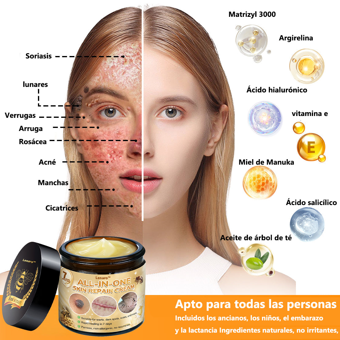 A diferencia de las cremas típicas que solo tratan la superficie, esta fórmula avanzada actúa profundamente en la piel para sanar y restaurar desde adentro hacia afuera. Enriquecida con veneno de abeja natural, estimula la producción de colágeno, mejora la circulación sanguínea y promueve la renovación celular. Estas potentes acciones ayudan a eliminar el acné, atenuar cicatrices y estrías, aliviar el eccema, la urticaria y la psoriasis, y reducir la aparición de arrugas, lunares, verrugas cutáneas y manchas oscuras como el cloasma.